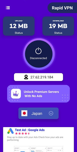 Rapid VPN App is very fast and secure vpn app with unlimited bandwidth and lot of secure servers in this app when you click on select option you can see vpn server lists.In this app you can connect any country server on only one click. when you connect with any server you can see kbs speed now You can easily unblock those ego-restricted websites and gain access. If you want to Become Pro member Just click on remove ads and enjoy ads free app.