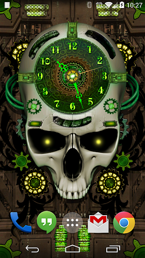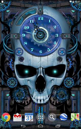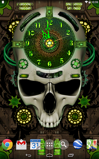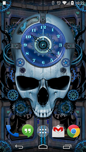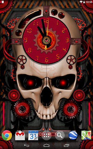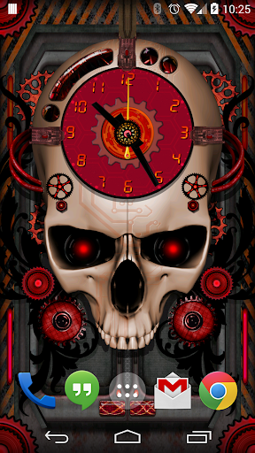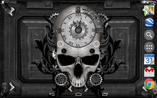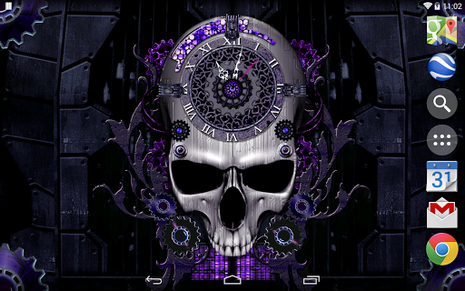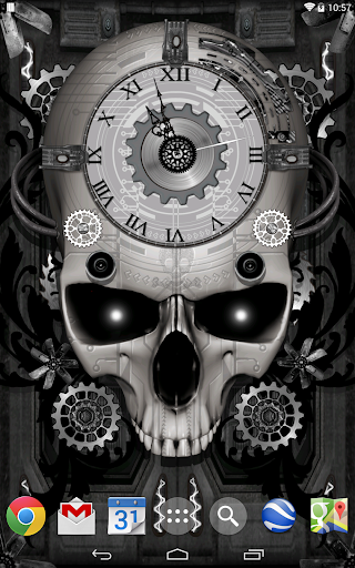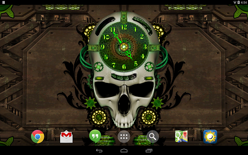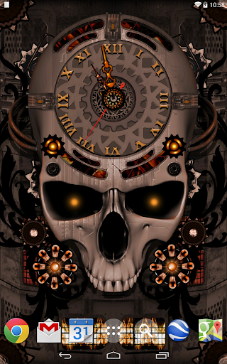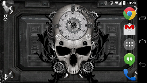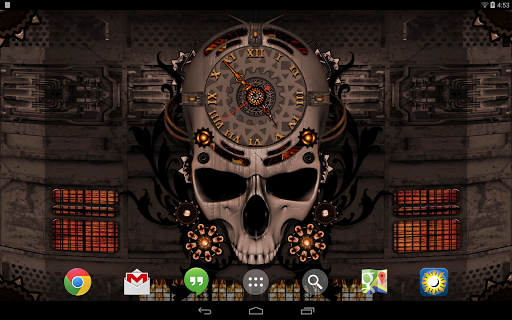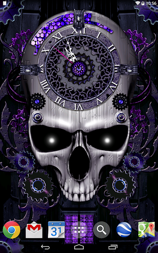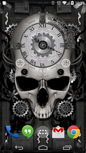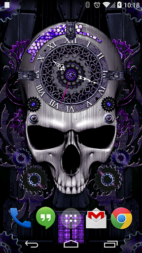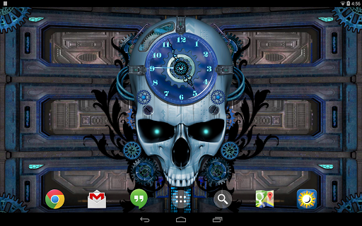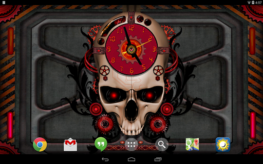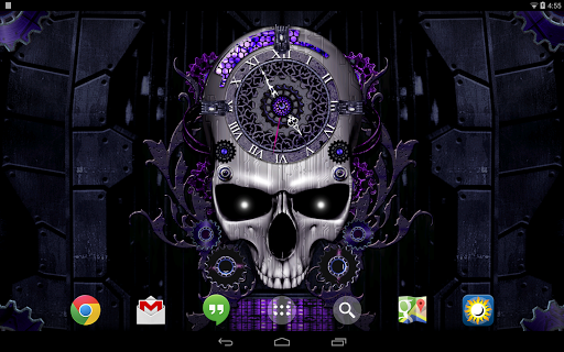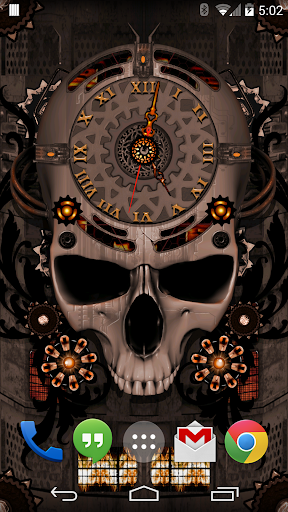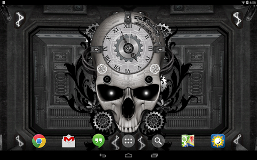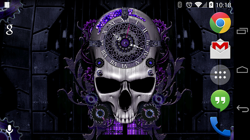 Live Wallpaper featuring a Steampunk Skull Clock with 6 complete themes, rotating gears, animated lights and many customization options. People have been asking for us for a clock, and we're excited to finally bring this to you!