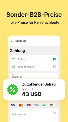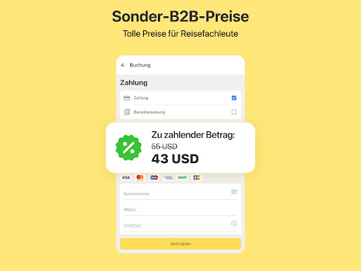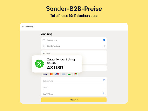 Sie können zu günstigen Preisen aus über 1.300.000 Hotels, Pensionen, Herbergen und Appartements für Firmenkunden und Reisebüros wählen. Wir arbeiten direkt mit großen globalen Bestandsanbietern und Zehntausenden von Hotels zusammen. Dies ermöglicht es uns, Ihnen die besten Preise anzubieten und Ihr Geld zu sparen.