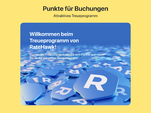 Buchungen auf RateHawk sind sehr preisgünstig. Buchen Sie Hotels, sammeln Sie Punkte und verwenden Sie diese ganz oder teilweise, um Ihre eigenen Buchungen zu bezahlen oder um Kunden Rabatte zu gewähren. 1 Treuepunkt = 1 Währungseinheit.