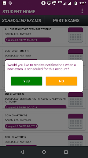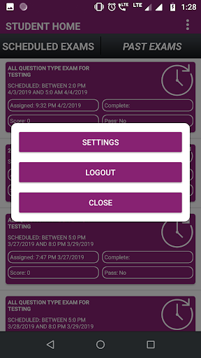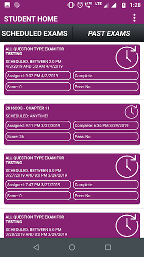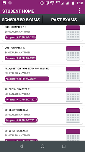 Students, using their existing accounts, may log in to view their past exams, view any scheduled exams, and to take a scheduled exam.