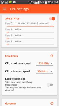 [*] Example: You can configure it to automatically toggle your cpu's frequency to a very low value once your screen turns off, to save battery, and restore the value when you are using your phone again.