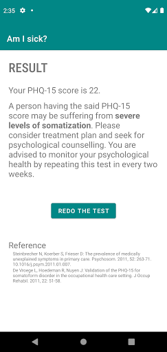 The Patient Health Questionnaire-15 (PHQ-15) is a fifteen item questionnaire designed to identify person with somatic symptom disorder. This test consists of 15 somatic symptoms that comprises more than 90% of the physical problems reported, excluding upper respiratory symptoms. It helps identify the relationship between gradual increases in somatic symptom severity and various health outcomes.