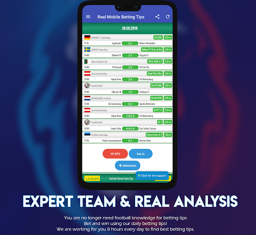 In our Real Bet VIP Correct Score Tips applications, there are only football betting tips. We are analysis 40 leagues in the world and provide you tips. We are providing special high odds tips every day of year. We win a lot and we want you win too.