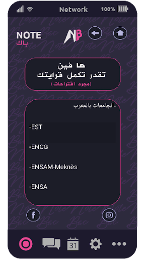 Notitie Bac biedt een goede post-baccalaureate oriëntatie door de student de meest geoptimaliseerde keuzes met de student voor te stellen acht zijn algemene gemiddelde en specialiteit.Bijna de meerderheid van de Marokkaanse openbare engineering- en handelschools zijn gecatalogiseerd in de applicatiedatabase om de meest verstandige en de meest efficiënte keuzes te bieden.