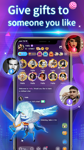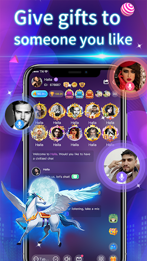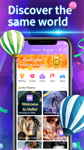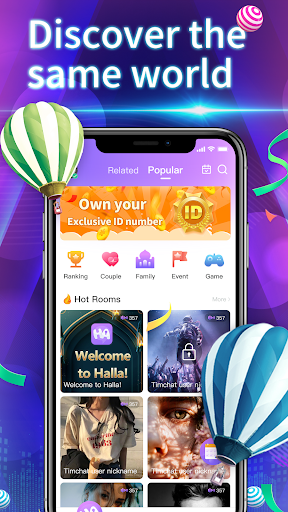 In a Halla, you can have voice conversations with your friends and groups without showing your face. Talk about what you care about-music, travel, food, sports, games. And so on. You can also play your favorite music in your room, sing karaoke or play interesting games.