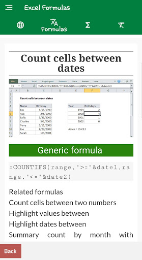 500 ++ excel formulas with example such as Count, Sum, Average, Min and Max, Lookup, If, conditional formatting, data validation, Round, Date and Time, Date series, Text, Financial, and so on.