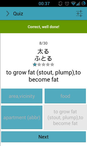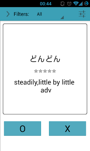 Learn on the move. Do you want to study for the JLPT(Japanese Language Proficiency Test) or do you just want to build you vocabulary and knowledge of the Japanese Language. If so then this is the app for you. Use flashcards to study quickly whenever you have the time. Then test yourself with our quiz. Coming soon quiz and practice for level 3