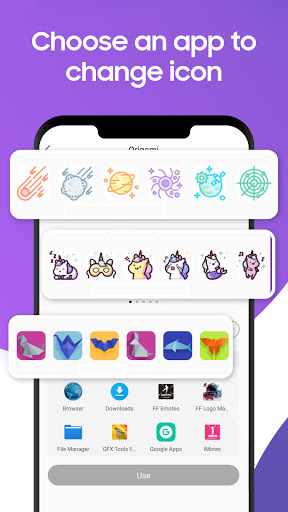 Icon Changer - Customize Icon, Themes & Wallpapers can replace the app icons on the home screen with a variety of pictures to make your home screen unique and show your personality and preferences. App Icon Changer provides a wealth of well-designed icons, themes and wallpapers, you can choose from them as you like. With the custom icon feature, you can also choose your favorite pictures and photos from the local album to set as app icons.