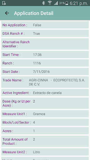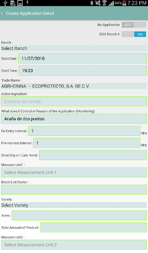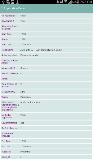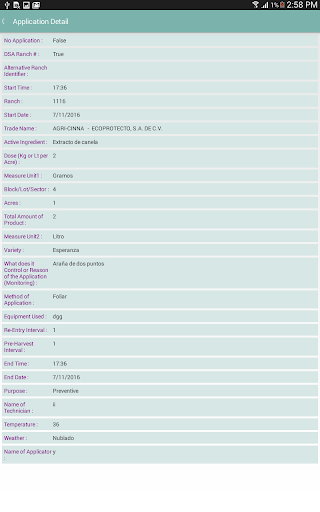 Monitoring app is used to collect scouting of Plagues and Disease on the Ranch in a daily basis. This information is used by the agronomist to determine if any pesticide is needed and appropriate dosage for fumigation. This step is before Food Safety audits.