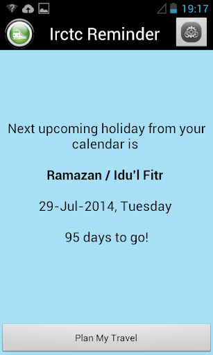 This OFFLINE app reminds you whenever the Advance Reservation ticketing window of IRCTC opens for the holidays you have planned for travel...