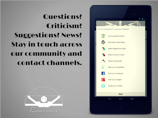 For feedback, suggestions, bug reports or just find Renascienza community, use the convenience of the "Contact Us" menu in the application or write to renascienza@gmail.com