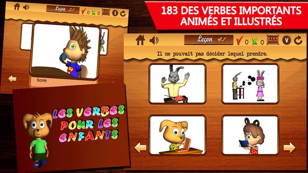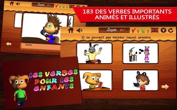 « Les Verbes pour les enfants » a plus de 180 verbes illustrés façon cartoon et ils sont animés en 3D de haute qualité. L’application contient les verbes parmi les plus courants (100 animés et 83 illustrés), accompagnés de sons : effets sonores et lecture de chaque verbe. Le but ici est d’apprendre les verbes au niveau du mot en tant que tel, puis, au niveau d’une phrase. Le second objectif est de développer le vocabulaire, de parler en utilisant la construction verbale et enfin d’acquérir le langage.