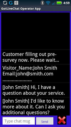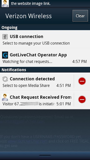 c) Log in as an operator using this application. This application will constantly check to see if anyone is requesting to chat with you (which is done by the web site visitor clicking on your 'chat now' image button).