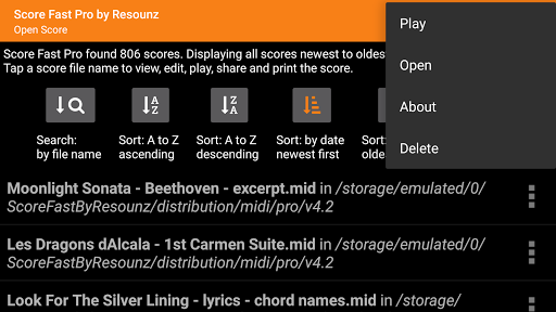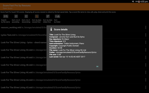 - When selecting an existing score to open you can listen to any score, view details about any score, and delete any score.