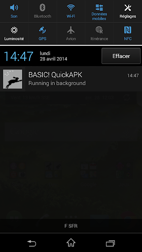 After download, run the BASIC! QuickAPK (WiFi) app on your Android device and hit the Home key to send it to the background. The app will intercept incoming commands from your computer and dialog with the QuickAPK program. No additional configuration is needed: as long as computer and phone or tablet are on the same LAN they autodetect each other.