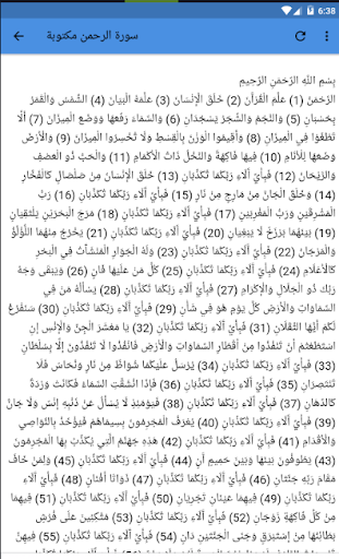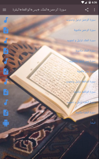 The application contains Surah Al-Rahman Al-Malik Ya-Al-Waqi`ah Al-Baqarah