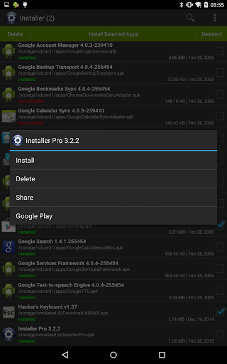 Full featured installer with tiny size, user friendly design and high performance. Scan and install market and non-market apps easily from your SD card.
