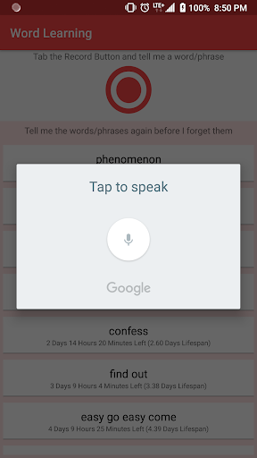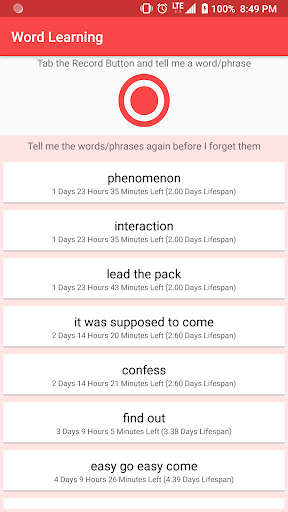 When we learn a new word or phrase, most likely, we forget it if we don't face on it again. This app helps you to add words and phrases, simply by telling it the new/exist words. The words have lifespans. If the word will not be reviewed again, it will be disappeared and deleted for ever. However, if the word will be reviewed, its lifespan get multiplied by 1.3. For example, after we add "Book" word to the app, the word sits on storage for 2 days. If we review the word anytime between its lifespan, a new lifespan will be generated, which will be more than 2 days. The lifespan will be 2.6 days. If we review it again, the lifespan will be 3.38 days. Then 4.40 days, 5.72 days, 7.44 days... Therefore, if we review the words and phrases over and over, we don't forget them easily, and they stuck in our minds for longer lifespan.