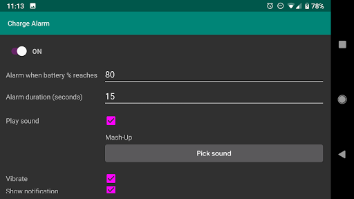 This app is called Battery Charge Alarm. It's completely free, no ads.