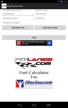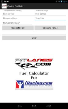 This app allows the user to enter average fuel per lap, number of laps & number of stops and calculate needed fuel for the number of stints. It also allows the cars range to be calculated.