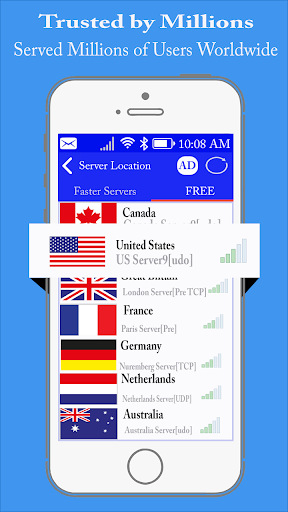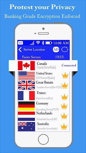 Fast VPN protects your network traffic under WiFi hotspots. You can search anonymously and securely without being tracked. Military-grade AES 120-bit encryption to secure WiFi hotspot. IP protocols and OpenVPN protocols(UDP / TCP) to mask your online identity.