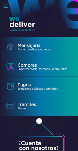Teslim ederiz PTY, "Zaman" ın maksimum optimizasyonuna izin veren uygulamadır.konut kullanıcıları ve ticari kullanıcılar, ev veya ofis görevlerinin bir kısmını zaman ve enerji yatırmak zorunda kalmadan devredmelerine izin veriyor. Uygulama aracılığıyla kullanıcı, parsel gönder, başka bir kişiye paket gönderin, istemek gibi bir dizi çözüme erişebilir. Bir parsel toplamak, fiziksel veya çevrimiçi bir ticarette satın alma, eczanede, mağazada, ayrıntılı süpermarkette veya üyelikle veya üyelik olmadan toptan satış isteyin, kamu veya özel hizmetlerin ödemelerini talep edin ve aracınızın plaka yönetimini talep edin.