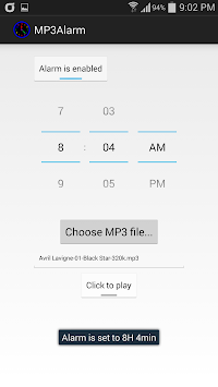 This is a simple alarm application that can use MP3 file as an alarm sound. Simple and clean. No advertisement at all. Users must disable manner mode(silent mode) before use this app.