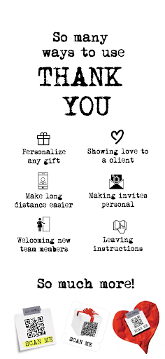 Send a personalized virtual message near, far or wherever you are with Thank You. Create your own photo, video and even pdf message, then easily share them using Thank You QR code stickers. Here’s how it works:
