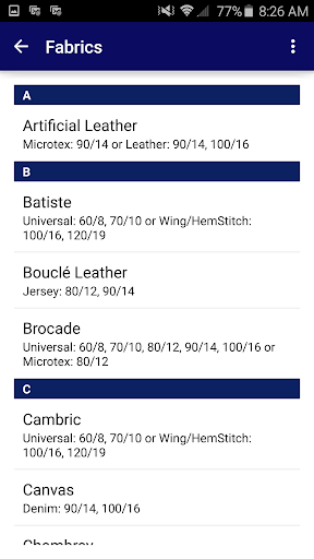 In addition to fabric recommendations and a dealer locator, the app also allows you to maintain an Organizer to keep track of the needles you have and a Wish List for those you want.