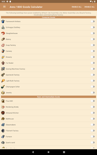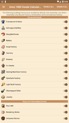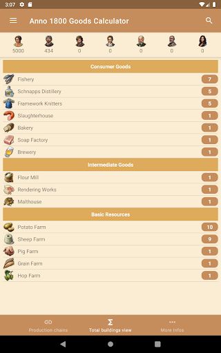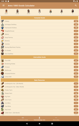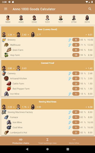 The Anno 1800 Goods Calculator for Android calculates the number of necessary production buildings for you based on your island population. This ensures the optimal supply of your inhabitants.