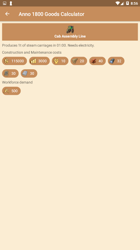 In addition, the app informs you about all details (e.g. construction and maintenance costs) of all production buildings.