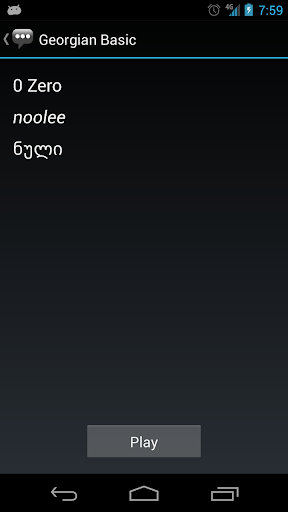 3. On the phrase detail page, the Georgian phrase is shown alongside its pronunciation and the equivalent English phrase. Press the Play button to hear the audio pronunciation by a native speaker.
