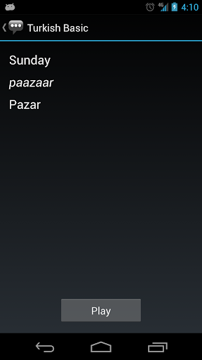 3. On the phrase detail page, the Turkish phrase is shown alongside its pronunciation and the equivalent English phrase. Press the Play button to hear the audio pronunciation by a native speaker.