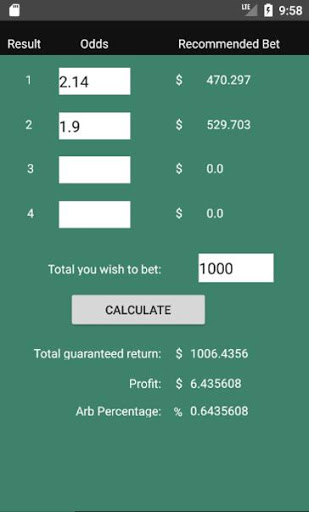 This application is an arbitrage calculator, it will let you know how much to bet on for each outcome according to the odds so that you can make a profit. It shows the recommended betting amount for each outcome's odds. It also displays the total guaranteed return along with the profit and the arbitrage percentage.