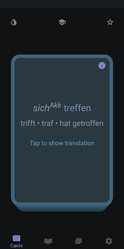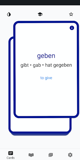 We have gathered the most useful German verbs. The verbs are shown on the flashcards which can be swiped by intuitive gestures. We offer different sets of flashcards grouping by difficulty level and other features.