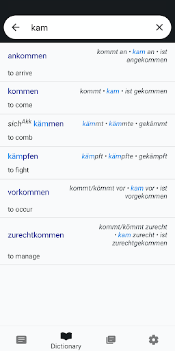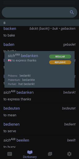 In the dictionary mode you can search verbs by means of the universal prompt. We support search by the Infinitiv form, Perfekt (Partizip 2) form, Präsens form, Präteritum form and by the translation.