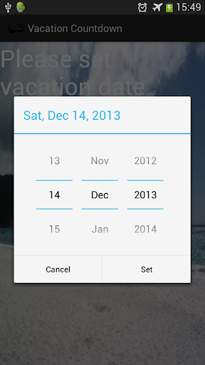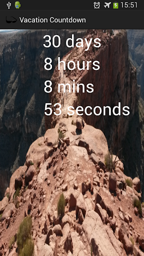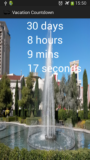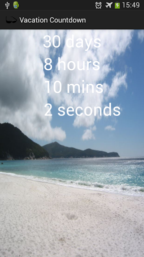 Count down the days, hours, minutes and seconds to your vacation / holiday with this app that will give you an exact time until your special day! Also customize the countdown by setting your own image in the background, and set the text color. Now also set the destination, and customize the size of the text to suit your own images!