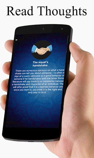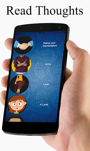 Mind triks: how to read the mind is a unique mind and thoughts reading application free online which gives it users the opportunity to know about the gestures and the actions associated with it. This app can give you a fair indication that how to attract someone and how to know about their real thoughts. The real thoughts mental toughness of someone can also be judged by this application online for free that how strong someone is. The body language of anyone represents his thoughts howto and intensions sometimes has some sort of deception .The application covers all how-to of gestures like palms and handshakes( open palms ,the hand palm up, the hand palm down ,indication with a finger) and the mind reading it also shows that arms, legs and looks has what kind of qualities to express . Mind triks: how to read the mind also has the gestures of legs and looks it shows that what does a smiley look means and what does the deception signals indicates about someone. how-to read minds is very important application in terms of giving mind reading of real thoughts awareness for everyone to know about the psychology of their gestures .Such types of applications are hard to find by because it needs extensive research and hard work to develop such kind of app so therefore that adds and extra element of importance to mind triks: how to read the mind. The hands and evaluation gestures shows you if someone is explaining something or deception of not. Do you want to become a glimpse of psychology and to become an expert in motion gestures of people around you? Are you curious about human nature? Do you want to feel good while explaining human behavior? Download mind triks: how to read the mind application now and have fun!