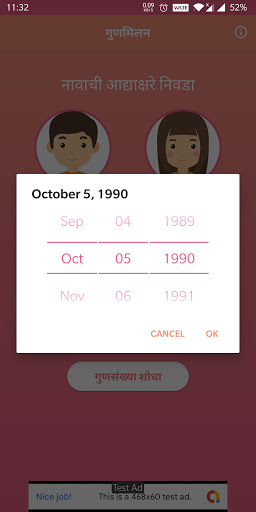 The app shows the matrimonial compatibility between two individuals based on there birth initials and birth date.