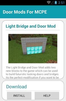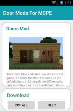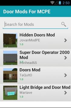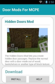 Door Mods For MCPE The Hidden Doors Mod lets you create hidden door passages. Replace the normal door with a door made out of wood, bookshelves or another type of block texture. It’s perfect if you want to build a castle with hidden rooms and such as it adds a lot to the user experience.