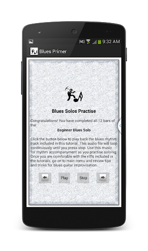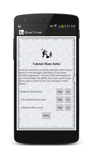 A well thought out blues tutorial app. Highly recommend this. My only suggestion would be to add the possibility of zooming on the solo tabs and also an audio version of it, with just the tab notes playing (no background music). Would gladly pay for more solo lessons in this style.