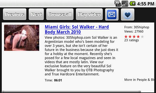 Do you want to see sexy girls videos from Los Angeles, Miami or Vegas?Watch every day new videos of beutiful american girls, centerfold models shootings and gorgeous babes. The hottest girls videos delivered to you daily so you can enjoy these cute dolls everyday day with your phone device.Features: ShareIf you find something to share with your friend you can do it via facebook twitter or email FavouritesKeep your favourite videos, add bookmarks so you can watch the videos many times. BrowseVideos can be browsed back and forward Watch Videos in landscape mode.This application is only for adults 18.Youre advised that there is no explicit porn, no pure naked content just american hot sexy girls videos.