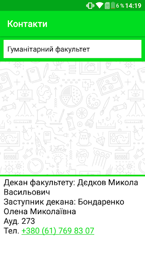 – «Контакти» дозволяє переглянути список факультетів та інформацію стосовно деканату, наприклад номер телефону приймальні та ім’я декана.