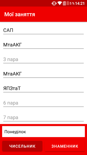 – «Мої заняття» допоможе Вам дивитися розклад занять на кожен день. Пари можуть бути зруповані за системою «чисельник/знаменник».