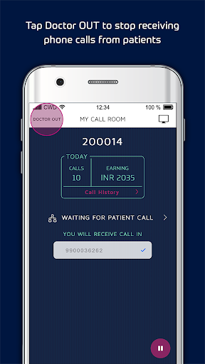 • Tap on “Doctor-Out” to stop receiving calls from patients. You will be notified about patient interest to talk if they dial your DPN in their “CallWithDoctor” App.