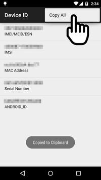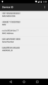 Check my android device IDs. List of android device IDs. * Unique number (IMEI, MEID, ESN, IMSI) * MAC Address * Serial Number * ANDROID ID