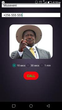 Yoweri MuseveniFake Call app allow you set a Caller name, Caller id, Caller image and voice, and start calling after a delay.