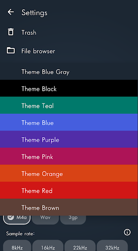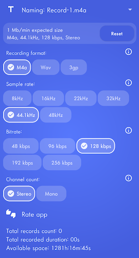 In settings, select sample rate, bitrate (for M4A only) and stereo or mono.