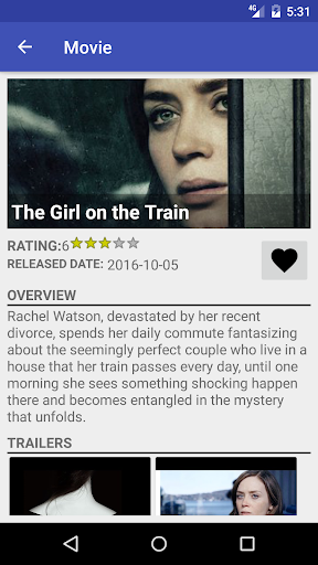 An app optimized for tablets, to help users discover popular and highly rated movies on the web. It displays a scrolling grid of movie trailers, launches a details screen whenever a particular movie is selected, allows users to save favorites, play trailers, and read user reviews.Other than reviews and trailers, detail screen includes rating,release date and synopsis,